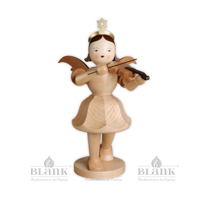 Der 50 cm hohe Faltenrockengel aus hellem Naturholz spielt verträumt auf seiner Violine und trägt ein kurzes Röckchen, auf dem die Maserung des Holzes schön zur Geltung kommt. Auf dem dunklen Haar des Engels sitzt ein goldenes Sternendiadem. Der Faltenrockengel wurde liebevoll in aufwendiger Handarbeit gefertigt und ist ein echtes Original aus dem Erzgebirge. Allein oder gemeinsam mit anderen musizierenden Engeln, auf dem Fensterbrett oder auf dem Boden – unser Faltenrockengel bringt bezaubernde Weihnachtsstimmung in Ihr Zuhause.