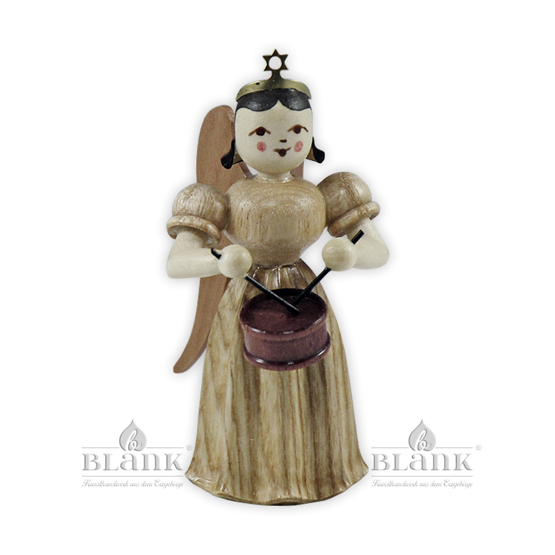 Dieser handgefertigte Faltenlangrockengel aus Naturholz wirkt mit seinem langen Gewand besonders festlich. Die Maserung auf dem Kleid kommt naturbedingt bei jedem Engel anders zur Geltung und macht so jede Figur zu einem individuellen Einzelstück.Der Engel spielt konzentriert auf einer kleinen Trommel und begleitet damit das große Engelorchester aus dem Hause BLANK, das in aufwendiger Handarbeit mit viel Liebe zu Detail direkt im Erzgebirge entsteht.