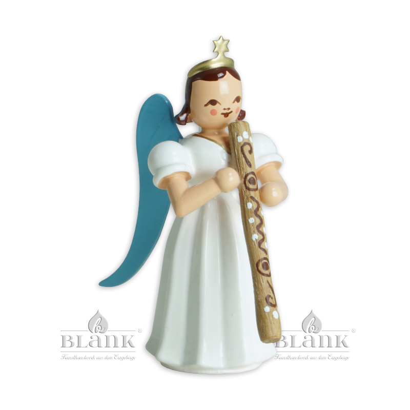 Der farbige Langrockengel mit Didgeridoo verbindet erzgebirgische Tradition mit einem Hauch des Exotischen: die feinteilige, gedrechselte Figur aus heimischen Hölzern ist das Ergebnis aufwendiger Handarbeit mit viel Liebe zum Detail. Das Didgeridoo aus dunklerem Eichenholz hebt sich dezent von der weißen Robe des Engels ab und überzeugt mit einer Bemalung, die es umso authentischer wirken lässt. Das glänzende Diadem, das freundliche Gesichtchen, das Kleid und die zartblauen Flügel des farbigen Faltenrockengels wurden allesamt von ruhiger Hand bemalt. Dies macht seine Herstellung so besonders und garantiert ausnahmslos höchste Qualität. Mit einer Höhe von etwa 7 cm präsentiert sich dieser Engel als Meisterwerk erzgebirgischer Handwerkskunst - eben "Echt Erzgebirge. Holzkunst mit Herz"®