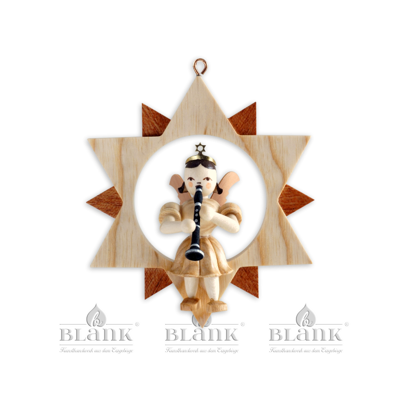 This charming little Angel with Pleated Skirt and golden diadem is sitting on a two-tone star propably playing lovely melodies on its hand-painted clarinet. The joy is written on his face. The artwork was handcrafted in our angel workshop and consists of light and dark natural wood. The star has a metal eyelet at the top so that it could be hung with a ribbon. The various details of the lovely Angel in a Star are elaborately designed. Decorate your Christmas tree with this fine artwork from the German Erzgebirge or decorate your window. You will just love it.