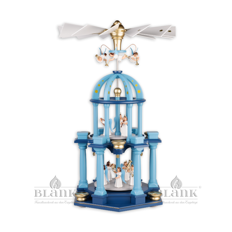 The traditional craftsmanship from the Erzgebirge is also immediately recognizable in this magnificent, colourful dome shaped pyramid with two floors and 8 long-robed angels. The craftsmen in our workshop in Grünhainichen lovingly produced this detailed Christmas pyramid in heavenly blue by hand. The artwork is 55 cm high and features 8 adorable Angels with Long Pleated Robes® in addition to 3 more hanging angels. The pyramid is operated with standard pyramid wax candles (∅14 mm).