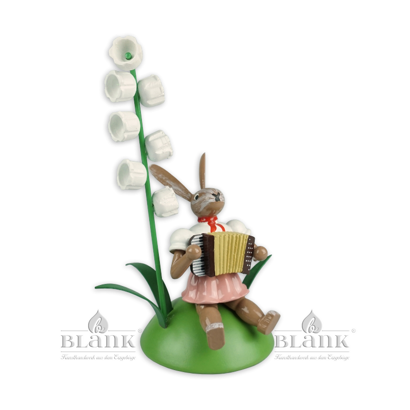 Our Sitting Easter Bunny with Lily of the Valley and Accordion is a charming and detailed figure that showcases the exquisite craftsmanship of our workshops. The bunny wears a pink pleated skirt, a white blouse, and a red scarf. It plays an intricately painted accordion, a testament to the artisanal skill required to craft such a complex instrument in wood. Beside it, a delicate lily of the valley blooms, with fine white bell-shaped flowers symbolising the freshness of spring. Handcrafted in our workshops in Grünhainichen, this figure is created with meticulous attention to detail. For over 70 years, Blank Kunsthandwerk has produced unique pieces bearing the "Echt Erzgebirge®. Holzkunst mit Herz" seal, ensuring the highest quality and authenticity. This Easter Bunny is a delightful addition to your spring decor, bringing music and the spirit of the season into your home.