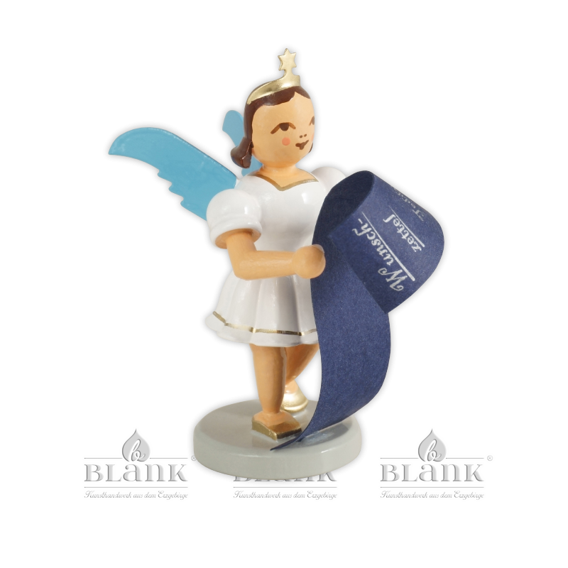 A wish list belongs to Christmas like a decorated Christmas tree and loving gifts. Of course, our Angel with Pleated Skirt also thought about that - checking his own with a knowing smile. Hopefully he has not forgotten anything on this noble, blue paper. The Angel belongs to a group of exclusive figures for the members of a specialist trade ring, and is therefore not available in every specialty shop.