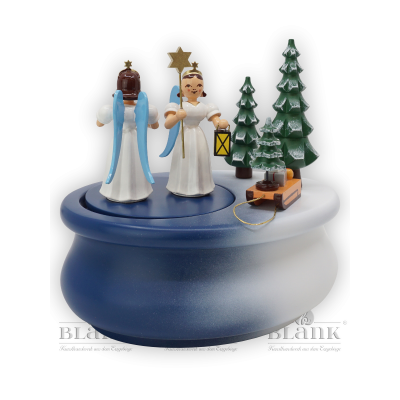 Die bezaubernde, farbige Spieldose aus Holz lässt zwei aufwendig gearbeitete Faltenlangrockengel als Gabenbringer durch eine angedeutete Landschaft wandern. Die ovale Form der Spieldose unterstreicht die Besinnlichkeit der Stimmung und präsentiert gekonnt die detailliert ausgearbeiteten Faltenlangrockengel. Einen uneingeschränkten Blick auf die liebenswürdigen Wanderer ermöglicht die seitlich versetzte Anordnung der entzückenden Figuren. Begleitet von der Melodie „Stille Nacht“ scheinen sie sich aufzumachen durch die winterliche Landschaft, um ihre Gaben zu überbringen. Handgefertigt und ausgezeichnet mit dem Zertifikat „echt Erzgebirge“ offenbart die Spieldose den Charme der Region. Zweifellos werden die beiden himmlischen Boten auch in Ihrem Zuhause eine besinnliche Adventsstimmung herbeiführen.