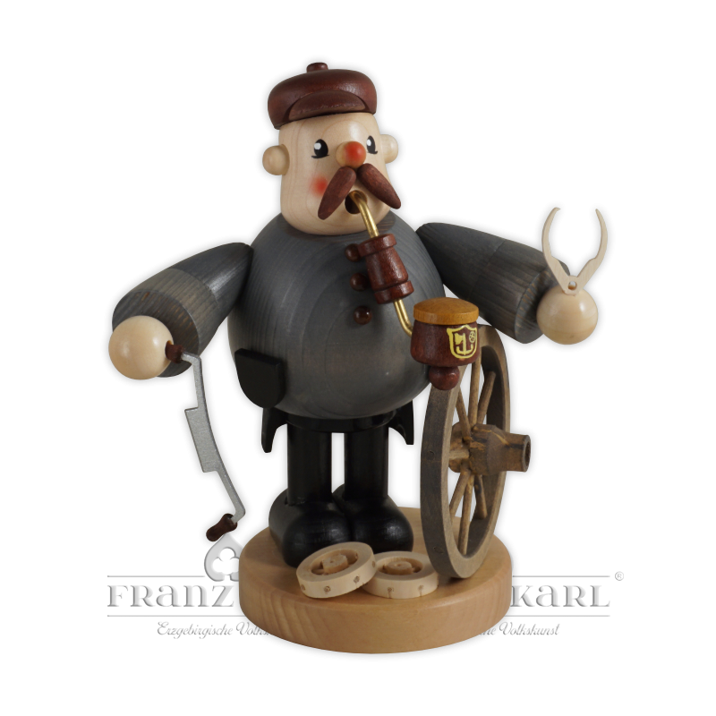 Wheels for wagons and agricultural implements are made in a wheelwright's workshop. The pipe smoker "Wheelwright" has the right tools at hand and is satisfied with the results of his work while enjoying a pipe with fragrant herbs. The smoke figure was made by hand in our workshops in Grünhainichen and consists exclusively of local woods. "Echt Erzgebirge. Holzkunst mit Herz®"