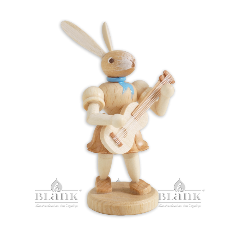 Zu den bekannten farbigen Osterhasen gesellen sich nun tanzende und swingende Osterhasen in Naturholzoptik. Dabei fällt ihre fröhliche, beschwingte Haltung ins Auge, die sofort Lust auf Frühling macht. Der 7,5 cm große Osterhase musiziert mit Freude auf seiner Gitarre: der geschwungene Korpus der Gitarre inklusive Schallloch ist mit sechs zarten Saiten bespannt, die auf millimetergroßen Stegen aufwendig von Hand angebracht wurden.. Dezent verziert mit einem blauen Halstuch spricht die individuelle Holzmaserung des sonst naturbelassenen Hasen für sich.