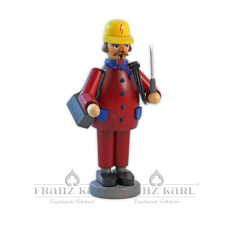 Ein farbenfroher Räuchermann zur Darstellung moderner Berufe. Der Elektriker hat alles dabei, um an die Arbeit zu gehen: Schraubenzieher, Kabel und Werkzeugkasten. Doch zunächst gönnt er sich noch ein Pfeifchen...Der Räuchermann wird mit handelsüblichen Räucherkerzen betrieben, die auf einem Metallteller im Inneren der Figur Platz finden. Dazu muss nur der Oberkörper abgenommen werden. Die handgearbeitete Figur der Marke FRANZ KARL trägt rote Arbeitskleidung und einen gelben Schutzhelm. Der Räuchermann wird in unserer Werkstatt in Grünhainichen gefertigt und ist ein erzgebirgisches Original. "Echt Erzgebirge.Holzkunst mit Herz®".