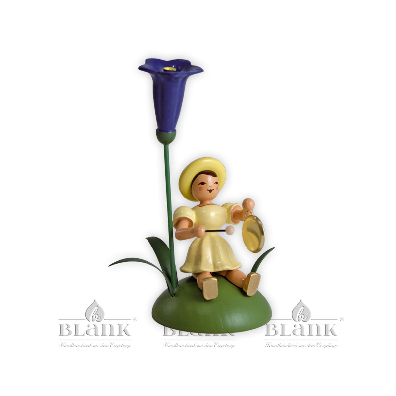Auf einem grünen Hügel, zwischen den ersten Grashalmen, hat es sich ein kleines Blumenkind bequem gemacht. Es hat sein schickes gelbes Faltenröckchen ausgebreitet und spielt auf einem Gong, um die Sonnenstrahlen im Frühling zu begrüßen. Direkt neben ihm wächst ein Enzian, dessen kräftig blaue Blüte schon das nahende Frühjahr ankündigt. Figur und Blüte werden in unserer Engelwerkstatt in Grünhainichen aufwendig handbemalt und mit viel Liebe zum Detail verziert.