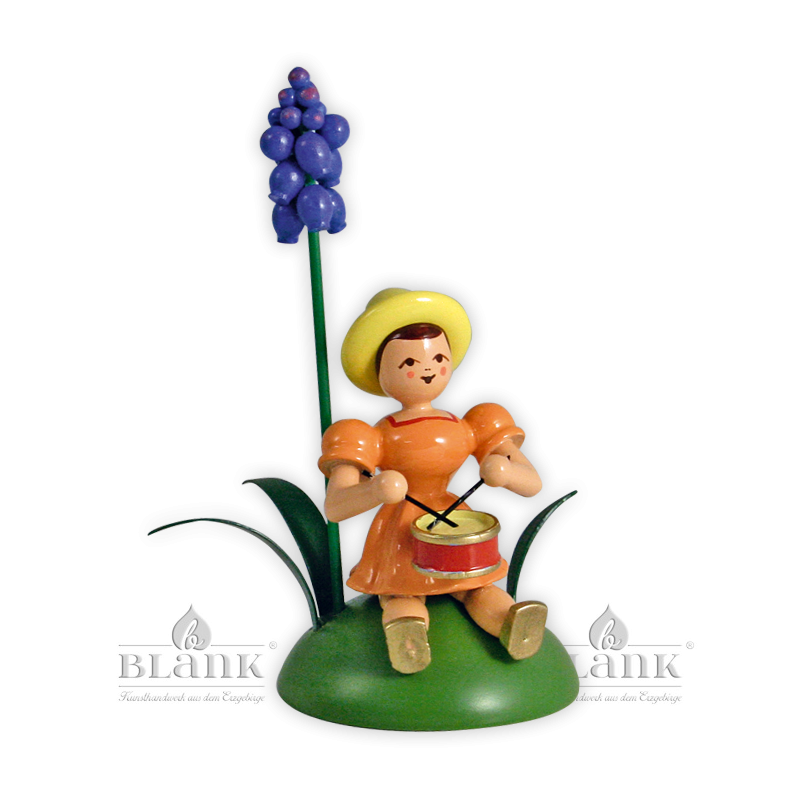 Auf einem grünen Hügel, zwischen den ersten Grashalmen, hat es sich ein kleines Blumenkind bequem gemacht. Es hat sein schickes orangfarbenes Faltenröckchen ausgebreitet und spielt auf einer Trommel, um die Sonnenstrahlen zu begrüßen. Direkt neben ihm wächst eine Traubenhyazinthe, deren feine blauen Blütenkugeln schon das nahende Frühjahr ankündigen. Figur und Blüte werden in unserer Engelwerkstatt in Grünhainichen aufwendig handbemalt und mit viel Liebe zum Detail verziert.