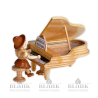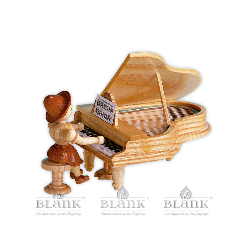 Ein kleines Mädchen mit Hut und Faltenrock spielt am Flügel eine bezaubernde Melodie. Sowohl die Figur als auch das Instrument sind aus naturbelassenem Holz gefertigt. Erfreuen Sie sich an dem detailreich gestalteten Kunstwerk aus unserem Traditionsbetrieb in Grünhainichen im Erzgebirge.
