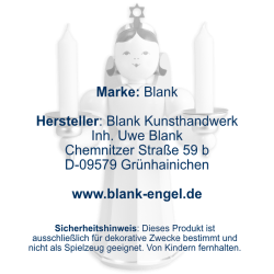 Dieser 22 cm große, farbige Langrockengel hält zwei goldene Kerzenhalter in den Händen und ist aufgrund seiner Größe das Schmuckstück einer jeden Dekoration. Er ist vollständig aus heimischen Hölzern gefertigt und in liebevoller Handarbeit mit feinen Details versehen. Der Engel trägt ein weißes, langes Gewand mit goldenem Saum und den typischen Falten. Das festliche Kleid passt hervorragend zu seinen himmelblauen, langen Flügeln und dem goldenen Sternendiadem. Die Figur wird in unserer Engelwerkstatt in Grünhainichen liebevoll von fachkundigen Händen gefertigt und ist ein zertifiziertes Qualitätsprodukt aus dem Hause BLANK Kunsthandwerk. "Echt Erzgebirge. Holzkunst mit Herz®“ In die Tüllen des Leuchters passen handelsübliche Pyramidenkerzen mit 14 mm Durchmesser.