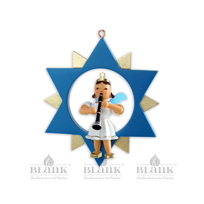 Dieser bezaubernde kleine Faltenrockengel® mit goldenem Sternendiadem sitzt vergnügt auf einem zweifarbig gestalteten Stern und spielt liebliche Melodien auf seiner kleinen Mundharmonika. Die Freude ist ihm dabei ins Gesicht geschrieben. Das Kunstwerk wurde in unserer Engelwerkstatt in Handarbeit gefertigt und besteht aus aufwendig handbemalten heimischen Hölzern. Der Stern ist an der Spitze mit einer Metallöse versehen, sodass er sich mit einem Band aufhängen lässt. Die Details des lieblichen Faltenrockengels im Stern sind aufwendig gestaltet. Zieren Sie Ihren Weihnachtsbaum mit diesem filigranen Kunstwerk aus dem Erzgebirge oder hängen Sie die Figur als Dekoration in Ihr Fenster.