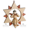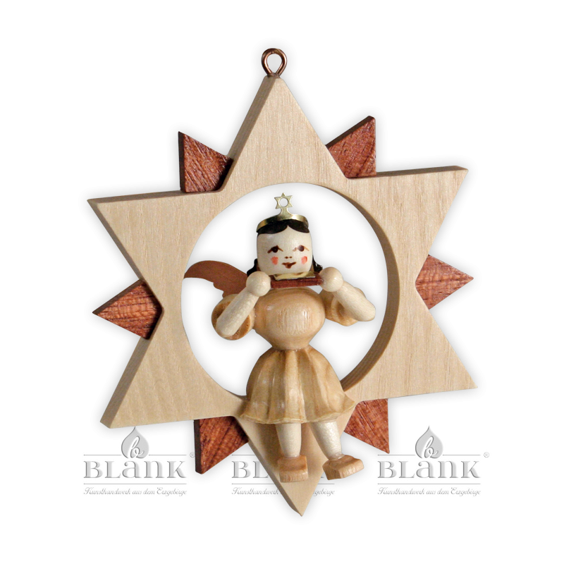 Dieser bezaubernde kleine Faltenrockengel® mit goldenem Sternendiadem sitzt vergnügt auf einem zweifarbig gestalteten Stern und spielt liebliche Melodien auf seiner kleinen Mundharmonika. Die Freude ist ihm dabei ins Gesicht geschrieben. Das Kunstwerk wurde in unserer Engelwerkstatt in Handarbeit gefertigt und besteht aus hellem und dunklem Naturholz. Der Stern ist an der Spitze mit einer Metallöse versehen, sodass er sich mit einem Band aufhängen lässt. Die Details des lieblichen Faltenrockengels im Stern sind aufwendig gestaltet. Zieren Sie Ihren Weihnachtsbaum mit diesem filigranen Kunstwerk aus dem Erzgebirge oder hängen Sie die Figur als Dekoration in Ihr Fenster.