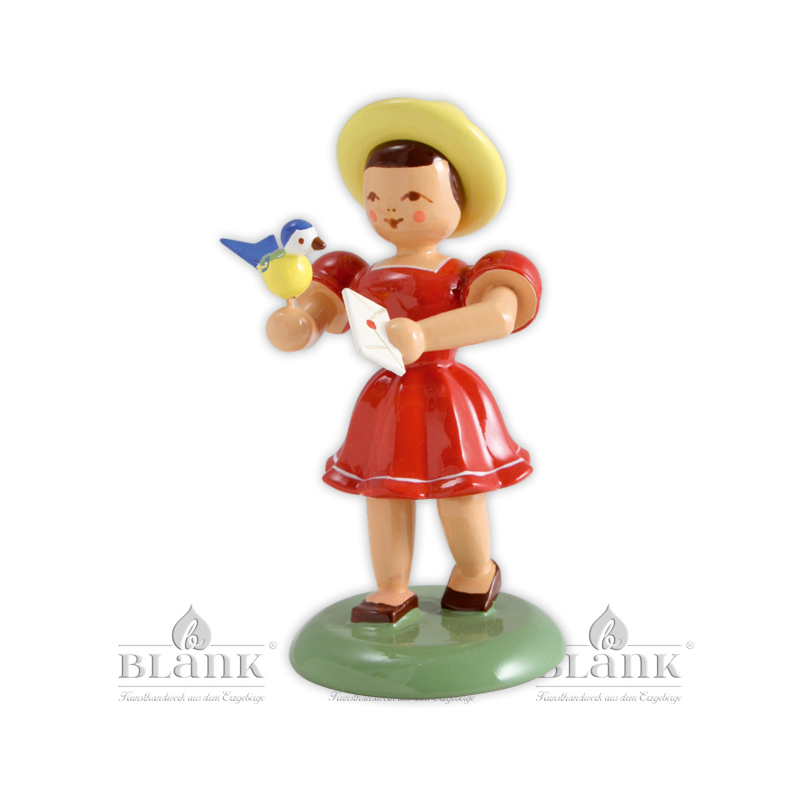 Mit Auguste senden Sie freundliche Grüße in die Welt, Brieftaube und Umschlag bringt sie gleich mit. Das fröhliche Mädchen mit dem roten Faltenröckchen, dem gelben Hut auf dem Kopf und dem einnehmenden Lächeln besteht aus heimischen Hölzern und wurde in unserem Handwerksbetrieb in Grünhainichen im traditionsreichen Erzgebirge hergestellt. Die vollständig handgearbeitete Miniatur überzeugt durch hohe Qualität und die viel Liebe zum Detail. Auguste ist eine schöne Dekoration für Ihre Wohnung und auch eine tolle Geschenkidee.
