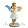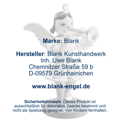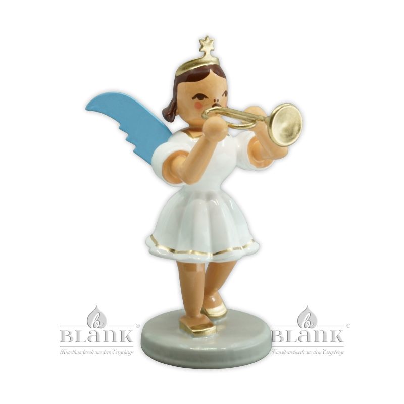 Dieser kleine Kurzrockengel mit dem einzigartigen Faltenröckchen von BLANK Kunsthandwerk spielt konzentriert auf seiner filigranen, goldenen Trompete. Er begleitet damit das große Engelorchester, das in aufwendiger Handarbeit in unserer Engelwerkstatt im Erzgebirge entsteht. Die farbige Figur ist aus verschiedenen heimischen Hölzern hergestellt und wird in ca. 150 Arbeitsschritten mit viel Liebe zum Detail zusammengesetzt. Malerinnen verleihen dem Engel schließlich einen freundlichen Ausdruck, verzieren sein Kleid mit einem goldenen Saum und geben ihm goldene Schuhe und blaue Flügel. Lassen Sie sich von diesem erzgebirgischen Original verzaubern.