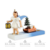 Ein kleiner weiß gekleideter Faltenrockengel hat sich durch den verschneiten Winterwald auf den Weg gemacht, um seine Weihnachtsgaben zu verteilen. Dazu hat er seinen Schlitten mit Geschenken und einem filigranen Weihnachtsbäumchen beladen und zieht diesen nun an einem goldenen Strick hinter sich her. Eine Laterne in der Hand haltend, freut er sich schon darauf, seine Geschenke weiterzugeben. Die Figur ist auf einem blau-weißen Brettchen befestigt, das genug Platz für eine Puppenkerze bietet, die das Ensemble in ein wohliges Licht tauchen kann.