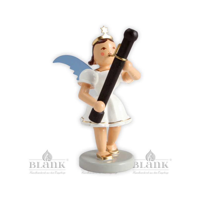 Dieser kleine Kurzrockengel mit dem einzigartigen Faltenröckchen von BLANK Kunsthandwerk spielt verträumt auf seinem Fagott. Er begleitet damit das große Engelorchester, das in aufwendiger Handarbeit in unserer Engelwerkstatt im Erzgebirge entsteht. Die farbige Figur ist aus verschiedenen heimischen Hölzern hergestellt und wird in ca. 150 Arbeitsschritten mit viel Liebe zum Detail zusammengesetzt. Malerinnen verleihen dem Engel schließlich einen freundlichen Ausdruck, verzieren sein Kleid mit einem goldenen Saum und geben ihm goldene Schuhe und blaue Flügel. Lassen Sie sich von diesem erzgebirgischen Original verzaubern.