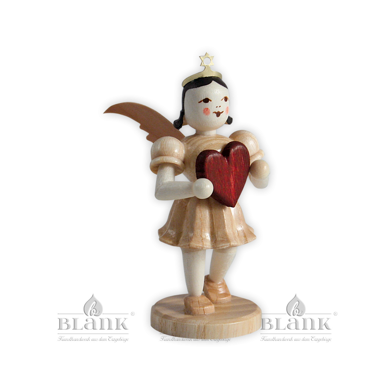 Dieser freundliche Kurzrockengel mit dem einzigartigen Faltenröckchen von BLANK Kunsthandwerk verschenkt lächelnd sein Herz und bringt mit dieser lieben Geste Augen zum Leuchten. Er vervollständigt das große Engelorchester, das in aufwendiger Handarbeit in unserer Engelwerkstatt im Erzgebirge entsteht. Die naturfarbene Figur ist aus verschiedenen heimischen Hölzern hergestellt und wird in ca. 135 Arbeitsschritten mit viel Liebe zum Detail zusammengesetzt. Malerinnen verleihen dem Engel schließlich einen freundlichen Ausdruck, sodass er jeden allein, oder im Ensemble, verzaubern kann.