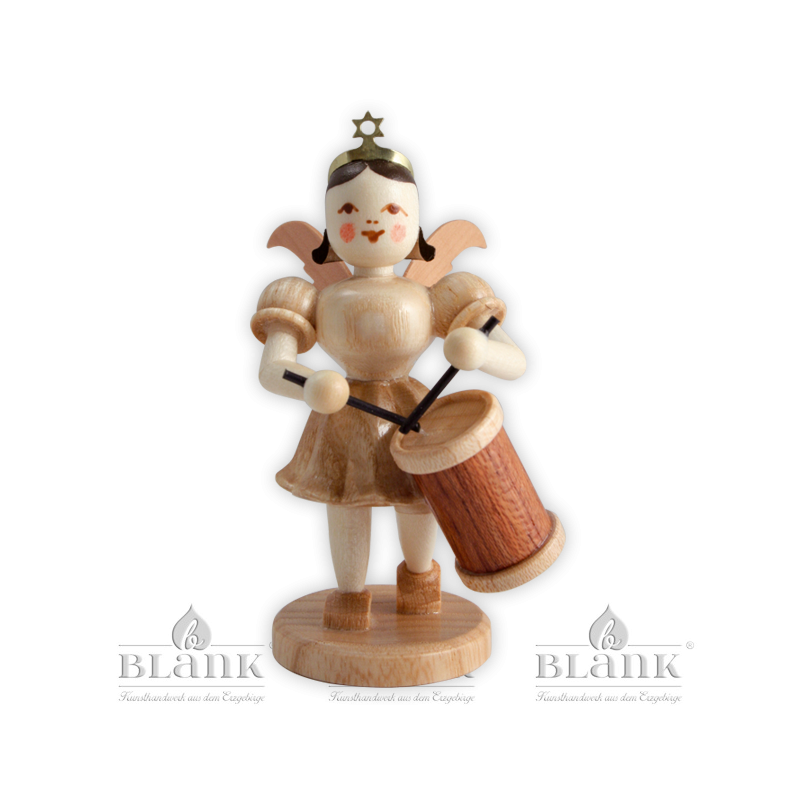 Dieser kleine Kurzrockengel mit dem einzigartigen Faltenröckchen von BLANK Kunsthandwerk spielt einen Rhythmus auf seiner zweifarbigen Langtrommel. Er begleitet damit das große Engelorchester, das in aufwendiger Handarbeit in unserer Engelwerkstatt im Erzgebirge entsteht. Die naturfarbene Figur ist aus verschiedenen heimischen Hölzern hergestellt und wird in ca. 135 Arbeitsschritten mit viel Liebe zum Detail zusammengesetzt. Malerinnen verleihen dem Engel schließlich einen freundlichen Ausdruck, sodass er jeden allein, oder im Ensemble, verzaubern kann.