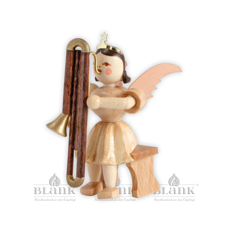 Dieser Faltenrockengel spielt im Orchester das Kontrafagott und sitzt dabei auf einer kleinen Bank. Die handgearbeitete Figur besteht hauptsächlich aus naturbelassenem Holz. Sie passt sehr gut zu den anderen musizierenden Faltenrockengeln aus Grünhainichen und vervollständigt so das große Engels-Orchester.