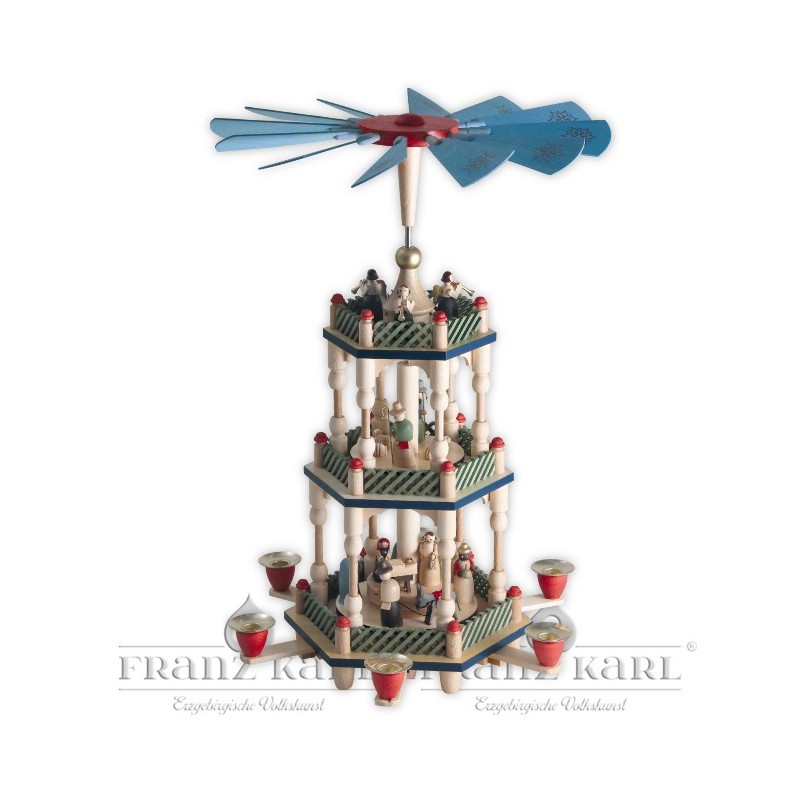 Um den Mittelpunkt dieser erzgebirgischen Weihnachtspyramide dreht sich eine umfangreiche Krippenszene auf zwei Etagen. In der unteren Etage ist die heilige Familie von den drei Königen und einem Eselshirten umringt. Darüber hüten Schäfer ihre kleinen, aber aufwendig gefertigten Tiere. Die gesamte Szene wird von drei Englein überwacht, die aus der Empore das Weihnachtswunder verkünden. Alle Figuren entstehen in liebevoller Handarbeit in unserer Werkstatt in Grünhainichen, bevor sie dann ihren festen Platz zwischen den gedrechselten Säulen dieser Pyramide finden. Die Pyramide ist vorrangig in den Farben rot, blau und grün gebeizt und wird mit handelsüblichen Pyramidenkerzen betrieben.