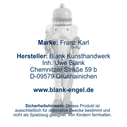 Heute vorrangig als Weihnachtsdekoration genutzt, wurden Nussknacker früher auch als Werkzeug zum Nüsse knacken verwendet. Mit Hilfe des Hebels am Rücken ist es ganz einfach Nüsse zu spalten, die man der Figur in den Mund legt. Die Figuren gibt es in unterschiedlichen Varianten. Sie werden seit Ende des 19. Jhr. im Erzgebirge hergestellt und sollen mit ihrem oft grimmigen Blick an die damaligen Obrigkeiten erinnern. Nussknacker entstehen in etwa 130 Arbeitsschritten und bis zu 60 Einzelteilen und werden mit unterschiedlichen Materialien verziert und farbenfroh bemalt.