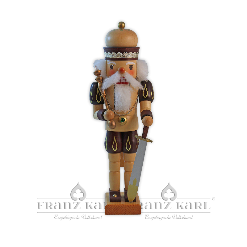 Lieferzeit ca. 10 Wochen Majestätisch und prachtvoll präsentiert sich dieser naturfarbene Nussknacker König in seinem aufwendig gestalteten Gewand. Durch die Verwendung hochwertiger Beizen und Lacke, wertige goldene Verzierungen und harmonische handgedrehte Formen ist diese Holzfigur ein beeindruckendes Zeugnis erzgebirgischer Handwerkskunst. Mit dem großen Schwert und dem goldenen Zepter in der Hand ist dieser König ein respektabler Vertreter seiner Zunft. Sein dichtes weißes Haar lässt ihn weise wirken und die große Krone mit Würde tragen. Der Nussknacker wird in unserer Werkstatt in Grünhainichen gefertigt. "Echt Erzgebirge. Holzkunst mit Herz."