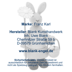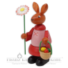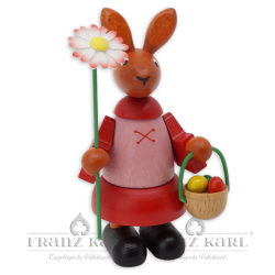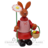 Diese kleine Hasenfigur ist die ideale Dekoration für Ihren Ostertisch, denn ihre frischen und leuchtenden Farben bringen den Frühling nach Hause. Fast ein bisschen schüchtern überreicht dieses Hasenmädchen eine schöne Margarithe, die es soeben von den Frühlingswiesen gepflückt hat. Und auch Ostereier hat sie schon gesammelt. Sie trägt die bunten Eier in einem kleinen Holzkörbchen. Die Holzfigur ist voller liebenswerter Details und wird in unserer Werkstatt in Grünhainichen aus heimischen Hölzern gefertigt und handbemalt. Sie ist ein echtes Original aus dem Erzgebirge.