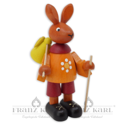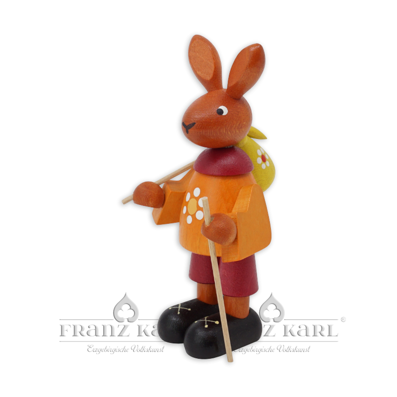 Diese kleine Hasenfigur ist die ideale Dekoration für Ihren Ostertisch, denn ihre frischen und leuchtenden Farben bringen den Frühling nach Hause. Der Osterhase hat sein kleines Bündel geschnürt, um sich auf Wanderschaft zu begeben. Den Wanderstab hat er schon parat. Die Holzfigur ist voller liebenswerter Details und wird in unserer Werkstatt in Grünhainichen aus heimischen Hölzern gefertigt. Sie ist ein echtes Original aus dem Erzgebirge.
