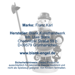 Vor langer, langer Zeit, als die Wälder noch viel größer und die Orte noch viel kleiner waren, gab es im Erzgebirge neben Moosmännchen und Wurzelzwergen auch das Volk der "Kleinen Pfeifenraucher". Sie heißen so, weil sie immer und überall ein Pfeifchen bei sich hatten, aus dem sie nicht etwa Tabak rauchten, sondern eine Mischung aus wohlriechenden Kräutern, deren Duft friedlich stimmte und Wohlbehagen verbreitete. Und auch heute nebeln sie dankbar jede Sorte von Räucherkerzchen, die man ihnen anbietet - ganz nach Ihrem Geschmack. Der Oberkörper der Figur lässt sich von den Beinen abnehmen, sodass man eine handelsübliche Räucherkerze auf die kleine Metallplatte im Inneren stellen kann. Nach Aufsetzen des Oberteils, raucht die Figur dann aus dem Mund. (Nicht unbeaufsichtigt lassen, kein Spielzeug.)