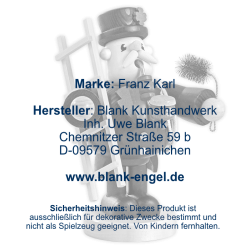 Wenn er in schwarz gekleidet mit Leiter und Stoßbesen durch die Straßen zieht, wissen Groß und Klein: es bringt Glück, wenn man den Schornsteinfeger berührt, oder die Knöpfe seiner Jacke reibt. Deshalb trägt unser kleiner Pfeifenraucher als Glücksbringer auch ein vierblättriges Kleeblatt am Hut und hat schneeweiße Knöpfe an der Jacke, da sie wohl schon ganz blank gerieben sind...Diese Rauchfigur entsteht in liebevoller Handarbeit in unserer Holzkunstwerkstatt in Grünhainichen. Sie ist ein zertifiziertes Original aus dem Erzgebirge und voller reizvoller Details. So trägt zum Beispiel jeder Pfeifenraucher sein ganz persönliches Zeichen auf der Pfeife, das Aufschluß über seinen Berufsstand gibt. Auf diese Weise regt jede Figur zum Sammeln und Geschichten erzählen an.