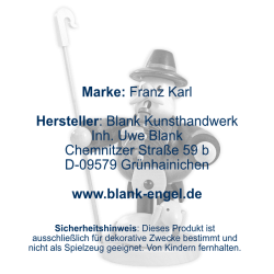Vor langer, langer Zeit, als die Wälder noch viel größer und die Orte noch viel kleiner waren, gab es im Erzgebirge neben Moosmännchen und Wurzelzwergen auch das Volk der "Kleinen Pfeifenraucher". Sie heißen so, weil sie immer und überall ein Pfeifchen bei sich hatten, aus dem sie nicht etwa Tabak rauchten, sondern eine Mischung aus wohlriechenden Kräutern, deren Duft friedlich stimmte und Wohlbehagen verbreitete. Und auch heute nebeln sie dankbar jede Sorte von Räucherkerzchen, die man ihnen anbietet - ganz nach Ihrem Geschmack. Der Oberkörper der Figur lässt sich von den Beinen abnehmen, sodass man eine handelsübliche Räucherkerze auf die kleine Metallplatte im Inneren stellen kann. Nach Aufsetzen des Oberteils, raucht die Figur dann aus dem Mund. (Nicht unbeaufsichtigt lassen, kein Spielzeug.)
