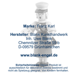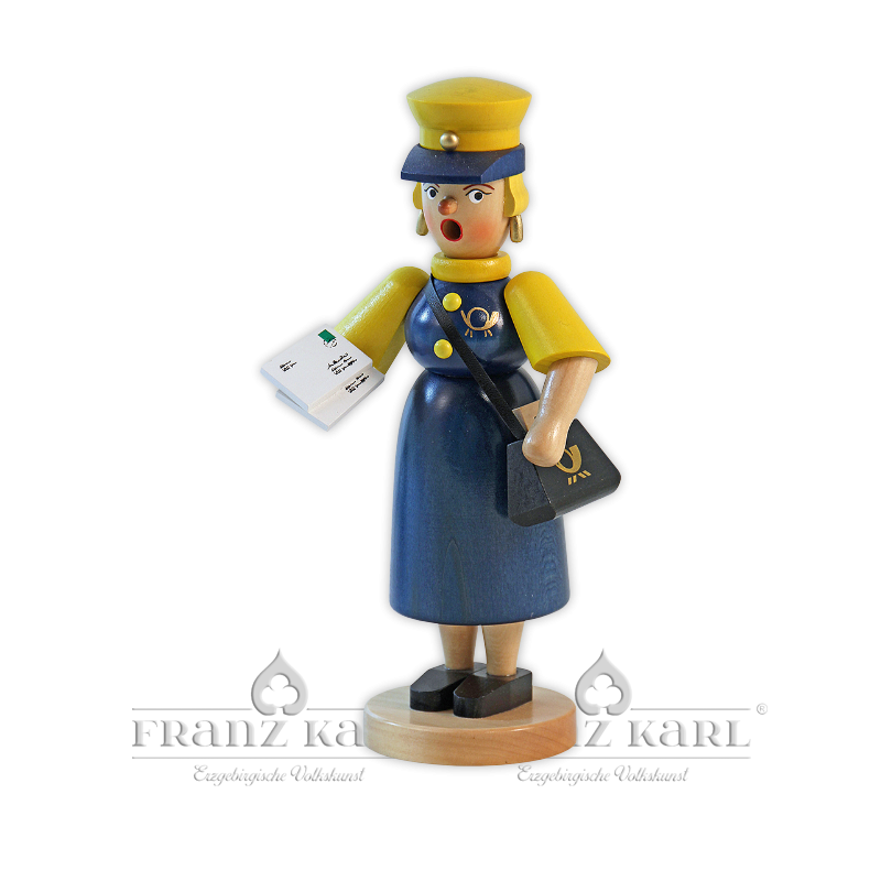 Rauchfiguren müssen nicht immer Räucher'männer' sein. Rauchfrauen stehen ihren männlichen Gegenstücken in nichts nach. Diese Postfrau geht ganz in ihrer Arbeit auf. Sie hat die heutige Post im Arm, die sie bei ihrer Runde verteilen wird. In ihrer schwarzen Posttasche sind noch weitere Sendungen. Abgerundet wird ihre Erscheinung durch die blau-gelbe Uniform, die Nostalgiker begeistern wird. Die Figur kann geöffnet werden, um innen ein Räucherkerzchen zu platzieren, damit die Dame angenehm duftenden Rauch verbreiten kann. Die Figur ist ein erzgebirgisches Original der Marke FRANZ KARL, das in liebevoller Handarbeit in unserer Werkstatt in Grünhainichen entsteht.