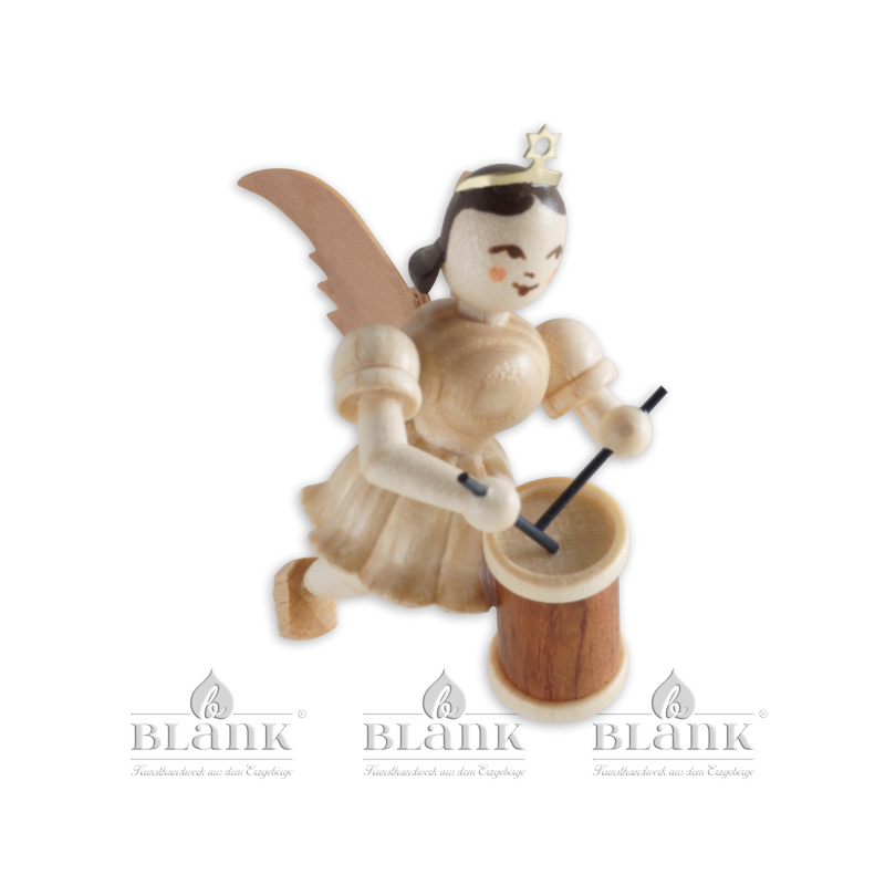 Lachend blickt dieser kleine Schwebeengel von oben auf seine musizierenden Freunde hinab. Sicher befestigt an einem goldenen Bändchen begleitet er das große Engelorchester aus luftigen Höhen. Die naturfarbene Figur mit kurzem Faltenröckchen spielt auf einer Langtrommel. Ob als Baumbehang, Geschenkanhänger, Wohnraumdekoration oder „kleines Mitbringsel“ - die schwebenden Faltenrockengel von BLANK sind echte Originale des erzgebirgischen Kunsthandwerks und werden jeden bezaubern. Die Figuren werden aus heimischen Hölzern vollständig von Hand gefertigt und begeistern durch ihre Einzigartigkeit. Dank der unterschiedlich gemaserten Hölzer ist jedes Stück ein Unikat.