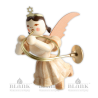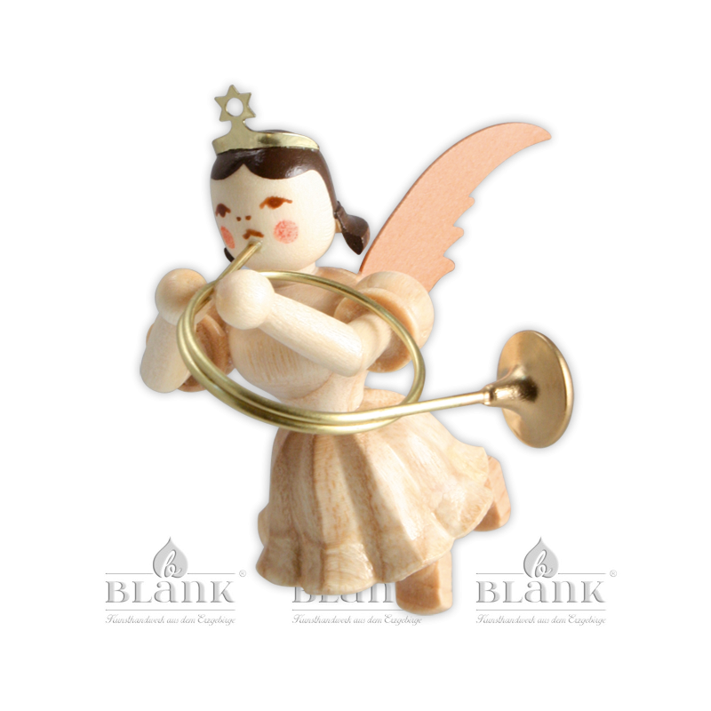 Freundlich blickt dieser kleine Schwebeengel von oben auf seine musizierenden Freunde hinab. Sicher befestigt an einem goldenen Bändchen begleitet er das große Engelorchster aus luftigen Höhen. Die naturfarbene Figur mit kurzem Faltenröckchen spielt auf einem goldenen Althorn. Ob als Baumbehang, Geschenkanhänger, Wohnraumdekoration oder „kleines Mitbringsel“ - die schwebenden Faltenrockengel von BLANK sind echte Originale des erzgebirgischen Kunsthandwerks und werden jeden bezaubern. Die Figuren werden aus heimischen Hölzern vollständig von Hand gefertigt und begeistern durch ihre Einzigartigkeit. Dank der unterschiedlich gemaserten Hölzer ist jedes Stück ein Unikat.