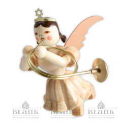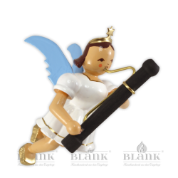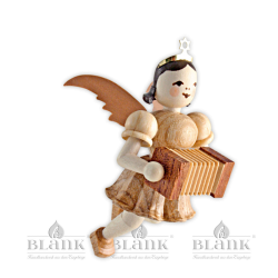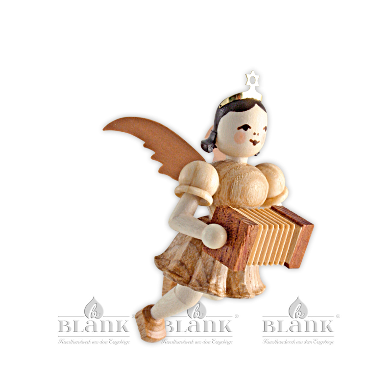 Freundlich blickt dieser kleine Schwebeengel von oben auf seine musizierenden Freunde hinab. Sicher befestigt an einem goldenen Bändchen begleitet er das große Engelorchster aus luftigen Höhen. Die naturfarbene Figur mit kurzem Faltenröckchen spielt auf einer fein gearbeiteten Harmonika. Ob als Baumbehang, Geschenkanhänger, Wohnraumdekoration oder „kleines Mitbringsel“ - die schwebenden Faltenrockengel von BLANK sind echte Originale des erzgebirgischen Kunsthandwerks und werden jeden bezaubern. Die Figuren werden aus heimischen Hölzern vollständig von Hand gefertigt und begeistern durch ihre Einzigartigkeit. Dank der unterschiedlich gemaserten Hölzer ist jedes Stück ein Unikat.