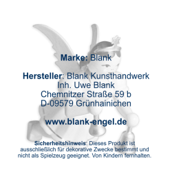 Freundlich blickt dieser kleine Schwebeengel von oben auf seine musizierenden Freunde hinab. Sicher befestigt an einem goldenen Bändchen begleitet er das große Engelorchster aus luftigen Höhen. Die farbige Figur mit kurzem Faltenröckchen trägt zwei goldene Glöckchen in seinen Händen. Ob als Baumbehang, Geschenkanhänger, Wohnraumdekoration oder „kleines Mitbringsel“ - die schwebenden Faltenrockengel von BLANK sind echte Originale des erzgebirgischen Kunsthandwerks und werden jeden bezaubern. Die Figuren werden aus heimischen Hölzern vollständig von Hand gefertigt und begeistern durch ihre Einzigartigkeit.