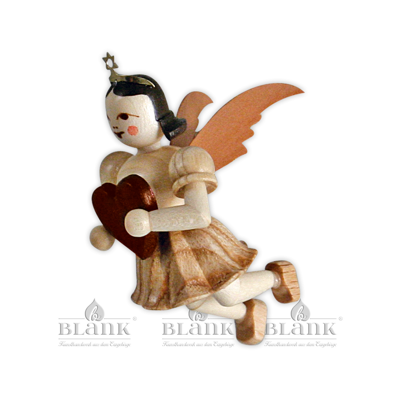 Freundlich blickt dieser kleine Schwebeengel von oben auf seine musizierenden Freunde hinab. Sicher befestigt an einem goldenen Bändchen begleitet er das große Engelorchster aus luftigen Höhen. Die naturfarbene Figur mit kurzem Faltenröckchen überbringt jedem, der gerade etwas Gutes benötigt, ein pralles Herz voller Glück. Ob als Baumbehang, Geschenkanhänger, Wohnraumdekoration oder „kleines Mitbringsel“ - die schwebenden Faltenrockengel von BLANK sind echte Originale des erzgebirgischen Kunsthandwerks und werden jeden bezaubern. Die Figuren werden aus heimischen Hölzern vollständig von Hand gefertigt und begeistern durch ihre Einzigartigkeit. Dank der unterschiedlich gemaserten Hölzer ist jedes Stück ein Unikat.