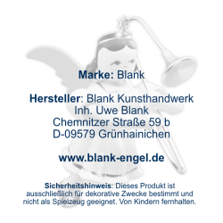 Freundlich blickt dieser kleine Schwebeengel von oben auf seine musizierenden Freunde hinab. Sicher befestigt an einem goldenen Bändchen begleitet er das große Engelorchster aus luftigen Höhen. Die farbige Figur mit kurzem Faltenröckchen spielt auf einer goldenen Zugposaune. Ob als Baumbehang, Geschenkanhänger, Wohnraumdekoration oder „kleines Mitbringsel“ - die schwebenden Faltenrockengel von BLANK sind echte Originale des erzgebirgischen Kunsthandwerks und werden jeden bezaubern. Die Figuren werden aus heimischen Hölzern vollständig von Hand gefertigt und begeistern durch ihre Einzigartigkeit.