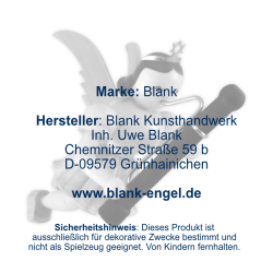 Freundlich blickt dieser kleine Schwebeengel von oben auf seine musizierenden Freunde hinab. Sicher befestigt an einem goldenen Bändchen begleitet er das große Engelorchster aus luftigen Höhen. Die naturfarbene Figur mit kurzem Faltenröckchen spielt auf einer goldenen Zugposaune. Ob als Baumbehang, Geschenkanhänger, Wohnraumdekoration oder „kleines Mitbringsel“ - die schwebenden Faltenrockengel von BLANK sind echte Originale des erzgebirgischen Kunsthandwerks und werden jeden bezaubern. Die Figuren werden aus heimischen Hölzern vollständig von Hand gefertigt und begeistern durch ihre Einzigartigkeit. Dank der unterschiedlich gemaserten Hölzer ist jedes Stück ein Unikat.