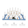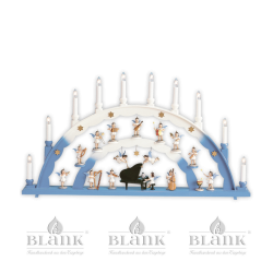 Zur Ausstattung dieses farbigen Schwibbogens gehören ein Faltenrockengel® mit weißem, kurzen Kleid am schwarzen Flügel und zwei bezaubernde, ebenfalls farbige, Schwebeengel mit goldenen Posaunen - alle weiteren Figuren lassen sich nach Wunsch zusätzlich bestellen (sind nicht enthalten). So lässt sich dieser elegante, in blau-weiß gehaltene Schwibbogen in eine Bühne für ein Orchester von Faltenrockengeln verwandeln. Der Schwibbogen gehört zu den Klassikern der adventlichen Handwerkskunst aus dem Erzgebirge. Unter dem beleuchteten Hauptbogen befindet sich ein kleinerer, auf dem neun Faltenrockengel Platz finden. Der Bogen verfügt über 10 elektrische Kerzen und kann mit Hilfe eines Schalters an und aus geschaltet werden. (passende LED-Birnen finden Sie bei den Ersatzteilen als "LED 23")