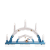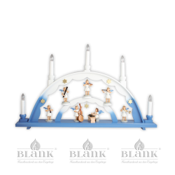 Ein kleiner, teils unbestückter, Schwibbogen in blau-weißer Optik, mit dem Sie die Präsentationsfläche für Ihre Faltenrockengel erweitern können. Der Bogen ist mit einem farbigen Faltenrockengel an der Zither ausgestattet, der unter einem goldenen Stern an einem Tischlein musiziert. Gewölbte Kanten und weitere kleine Ziersterne verleihen dem weihnachtlichen Fensterschmuck ein verspieltes Äußeres. Neben und über dem Engel ist Platz für weitere 6 Figuren, die Sie sich zum Beispiel aus unserem umfangreichen Sortiment zusammenstellen können. Der Schwibbogen erleuchtet die Szene mit fünf elektrischen Kerzen, die mit einem Schalter ein oder aus geschaltet werden können. Dieser Schwibbogen aus dem Erzgebirge ist in der Advents- und Weihnachtszeit ein stimmungsvoller Schmuck für Ihr Fenster.