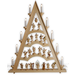 Eine ganze Engelschar findet auf der aufwendig gefertigten Schwibbogenspitze Platz, und von ganz oben sieht ein Schwebeengel, der fest an der Schwibbogenspitze angebracht ist, liebevoll auf die stehenden Faltenrockengel herab. Die Schwibbogenspitze bietet einen außergewöhnlichen Rahmen für die bezaubernden Faltenrockengel, die in dem kleinen Ort Grünhainichen im Erzgebirge in traditionsreicher Handarbeit hergestellt werden. Um sich und seine Lieben in besondere Weihnachtsstimmung zu versetzen, kann man die Engel ganz nach Wunsch auf der Schwibbogenspitze aus Echtholz aufstellen. Die elektrische Beleuchtung mit zehn LED-Kerzen betont die detaillierte Gestaltung der Figuren und sorgt für eine adventliche Atmosphäre in Ihrem Zuhause.