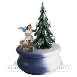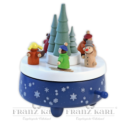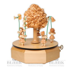 Auf der aus Naturholz gefertigten Spieldose drehen sich zur Melodie des Blumenwalzers fünf Laternenkinder. Die Figuren mit ihren kurzen Röckchen und Hüten auf ihrem Köpfen halten alle eine Laterne in ihren Händen. Sie sind gleichmäßig um einen Spanbaum in Form einer Linde gruppiert und drehen sich auf dem runden Dosenkörper zur Musik im Kreis. Nach dem Aufziehen lässt sich das Spiel mit einem an der Seite der Spieldose angebrachten Metallstab jederzeit unterbrechen. Der Spanbaum und die fünf Laternenkinder sind detailreich in liebevoller Handarbeit hergestellt und echt Erzgebirge, denn die Spieldose stammt aus der traditionsreichen Engelwerkstatt BLANK in Grünhainichen im Erzgebirge.