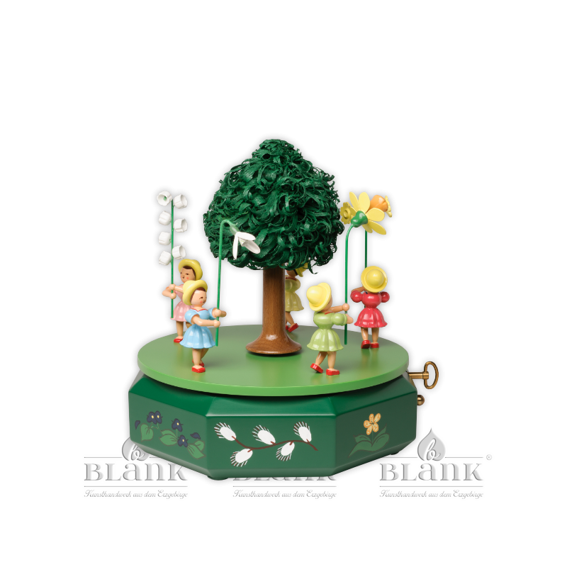 Diese zauberhafte, handbemalte Spieldose ist ein Stück traditionsreiche Handwerkskunst aus dem Erzgebirge und bringt Ihnen den Frühling ins Haus. Fünf Blumenkinder, gekleidet in leuchtenden Frühlingsfarben, tanzen um eine Linde und halten wunderschöne Frühblüher in den Händen - jede der fein gearbeiteten Figuren trägt eine andere farbige Blume. Die Spieldose ist liebevoll mit Blüten verziert und das Spielwerk lässt die kleinen Blumenkinder nach dem "Blumenwalzer" tanzen. Erfreuen Sie sich an einem Qualitätsprodukt aus Grünhainichen, das die Marke "Echt Erzgebirge®" trägt.