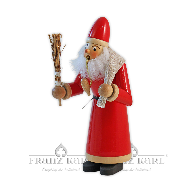 Knecht Ruprecht hat sich in seinem leuchtend roten Mantel auf den Weg gemacht, um artigen Kindern ein Präsent aus seinem Jutesack zu bringen ... in der rechten Hand trägt er einen Reisigbesen. Den langen Weg versüßt er sich mit einer duftenden Kräuterpfeife. Der Räuchermann kann mit klassischen Räucherkerzen zum Rauchen gebracht werden."Echt Erzgebirge. Holzkunst mit Herz®"