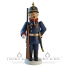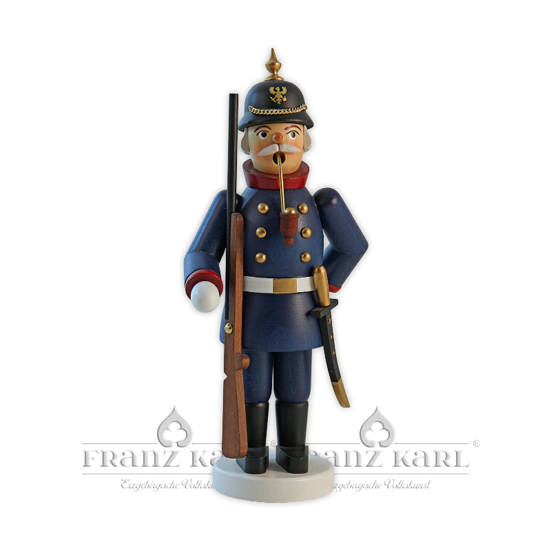 Nostalgische Rauchfigur, die an längst vergangene Zeiten erinnert. Der Preuße trägt eine blaue Uniform mit goldenen Knöpfen und hat eine typische Pickelhaube auf dem Kopf, die mit einer goldfarbenen Kette verziert ist. Er ist mit Säbel und Gewehr ausstaffiert und wartet mit blank geputzten Stiefeln auf Befehle. Der Räuchermann wird mit handelsüblichen Räucherkerzen betrieben, die auf einem Metallteller im Inneren der Figur Platz finden. Dazu muss nur der Oberkörper abgenommen werden.