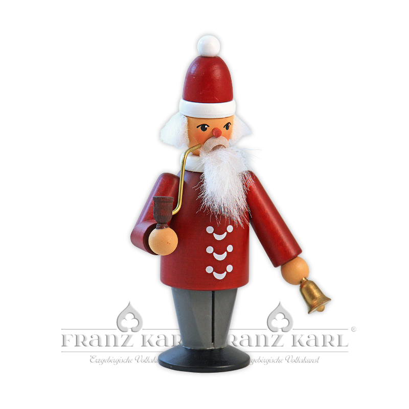 Typische erzgebirgische Rauchfiguren bilden häufig Berufsgruppen oder bekannte Figuren ab und laden den aufmerksamen Betrachter mit ihren Details zum Geschichten erzählen ein. Der kleine Nikolaus mit rotem Mantel, roter Mütze und langem, weißem Bart läutet ein goldenes Glöckchen - vielleicht, um alle Kinder herbei zu rufen und sie nach ihren Wünschen zu fragen. Während er wartet, nimmt er sich Zeit für eine Pfeife, mit der er den würzigen Duft von Räucherkerzen verbreitet. Das Oberteil der Figur lässt sich abnehmen, um im Inneren eine Räucherkerze zu platzieren. (Kein Spielzeug)
