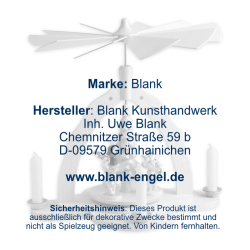 BLANK Kunsthandwerk ist ein traditionsreiches Familienunternehmen aus Grünhainichen im Erzgebirge, das seit 1955 filigrane Faltenrockengel und hochwertige Weihnachtsdekorationen herstellt. Neben Pyramiden, Schwibbögen, Nussknackern und Rauchfiguren werden auch Blumenkinder und Osterhasen in aufwendiger Handarbeit gefertigt. Dafür wurden die Produkte des Herstellers vom Verband Erzgebirgischer Kunsthandwerker und Spielzeughersteller e. V. mit dem Zertifikat "Echt Erzgebirge. Holzkunst mit Herz®" ausgezeichnet.