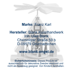 Auf dem Drehteller dieser Weihnachtspyramide umrunden die heiligen drei Könige mit ihren Gaben Maria, Josef und das Jesukind und werden dabei von einem Hirten begleitet. Die Szene spielt in einem Fachwerkhäuschen, an dessen Dachfirst ein goldener Stern strahlt. Die Weihnachtspyramide und die Figuren sind vollständig in Naturtönen gehalten. Sie wird mit vier Pyramidenkerzen betrieben. Die Weihnachtspyramide wird in Grünhainichen bei BLANK Kunsthandwerk hergestellt.